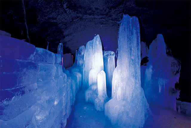 青木ヶ原樹海の豊かな緑に囲まれた富岳風穴。中に入ると夏でもひんやりと涼しく、平均気温は3度。昭和初期までは、蚕の卵の貯蔵に使われていたという天然の冷蔵庫。